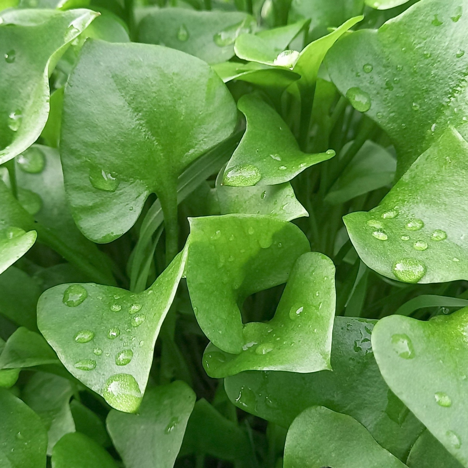 Miner’s lettuce, also known as ‘winter purslane’, is a cool weather annual growing between 10-30 cm in height. Leaves are borne at the end of short stalks followed by quantities of heart-shaped leaf pairs which completely encircle clusters of tiny white 5-petalled flowers when mature. The plant forms a mound from which the leaves can be harvested freely. Leaves are refreshingly crunchy and have a mild, succulent taste.