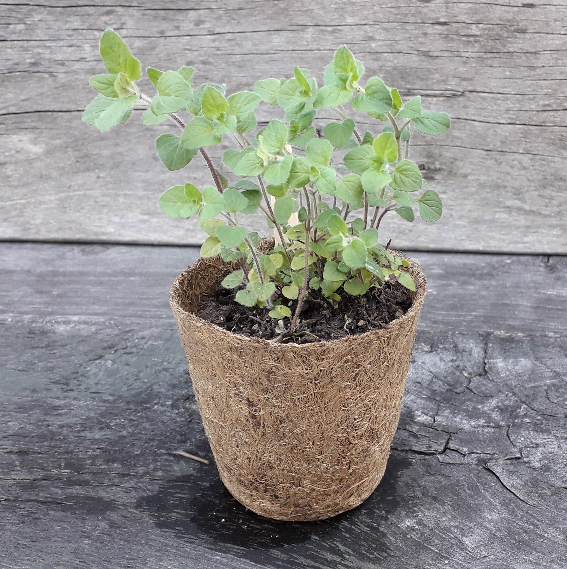 Organically grown plant in a biodegradable coir pot.